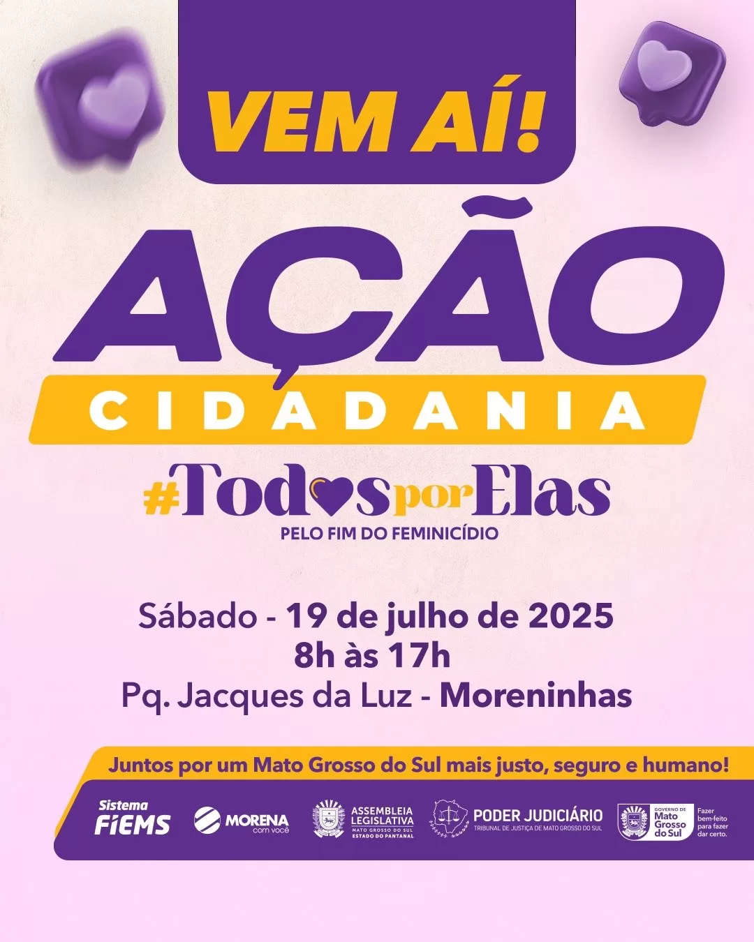 No próximo sábado (19), o Parque Jacques da Luz, nas Moreninhas, em Campo Grande, será palco da Ação Cidadania #TodoPorElas, pelo fim do feminicídio. Mais uma ação integrada entre o Judiciário, Executivo e a Assembleia Legislativa de Mato Grosso do Sul (ALEMS) para promover a conscientização sobre a segurança das mulheres e o combate à violência de gênero.