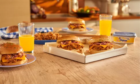 - Distribua o recheio de frango sobre os pães e coloque uma fatia de queijo cheddar em cada lanche. Cubra com a salada de repolho e cenoura.