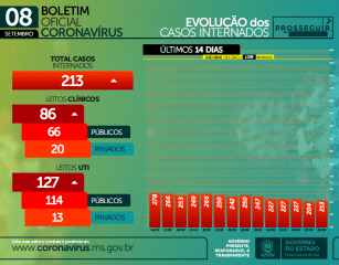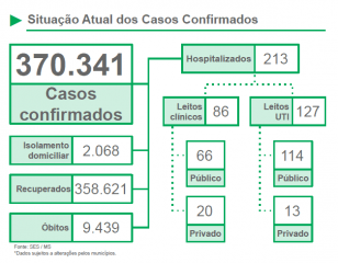 A taxa de ocupação leito SUS/UTI por macrorregião está em 57% em Campo Grande, 64% em Dourados, 42% em Três Lagoas e 42% em Corumbá.