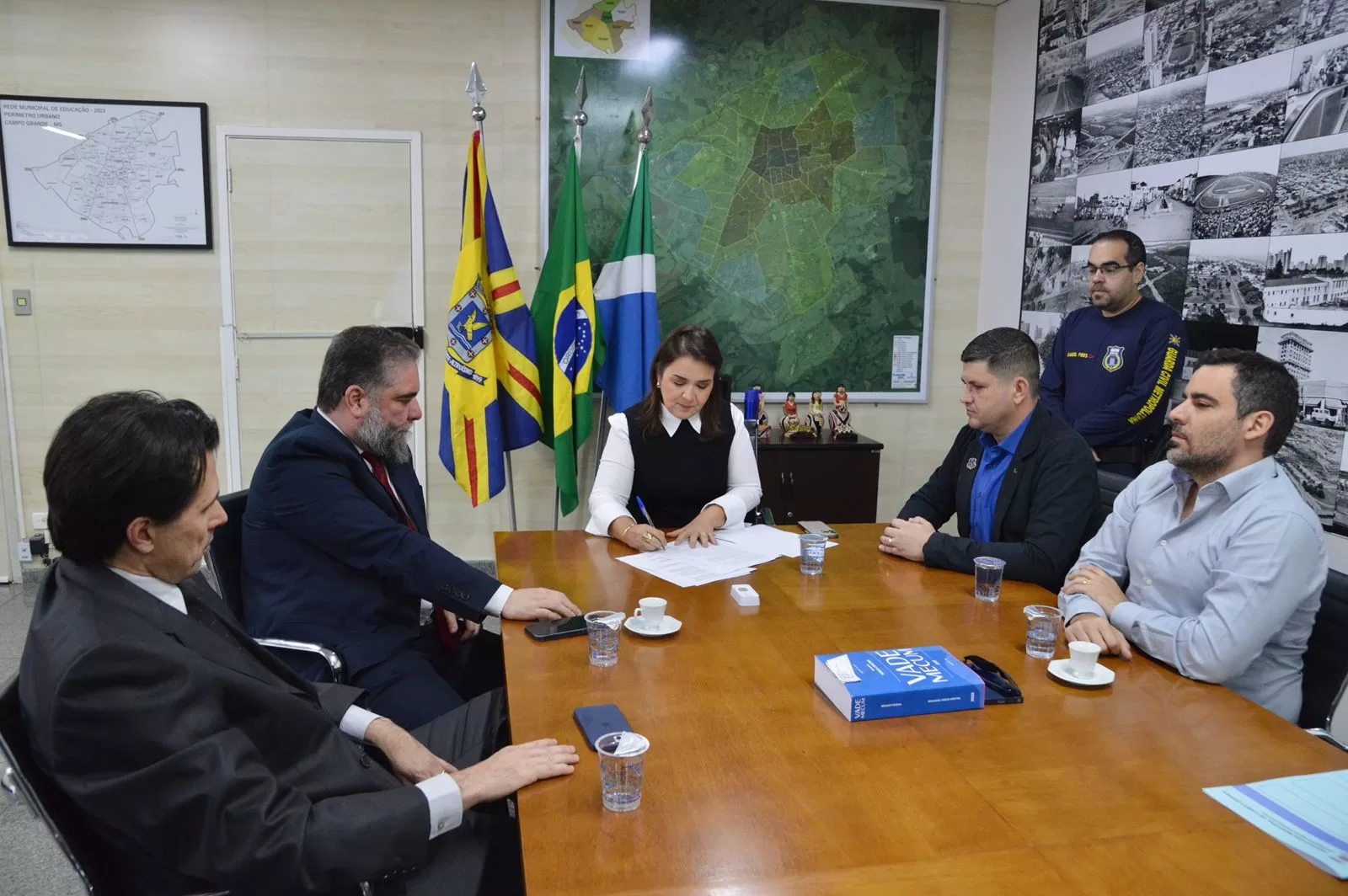 Durante reunião com o superintendente da Polícia Federal em Mato Grosso do Sul, Carlos Henrique de Oliveira, que aconteceu no gabinete do Paço Municipal, a prefeita Adriane Lopes enfatizou que o compartilhamento do sistema marca mais um avanço no trabalho de profissionalização da segurança pública municipal.