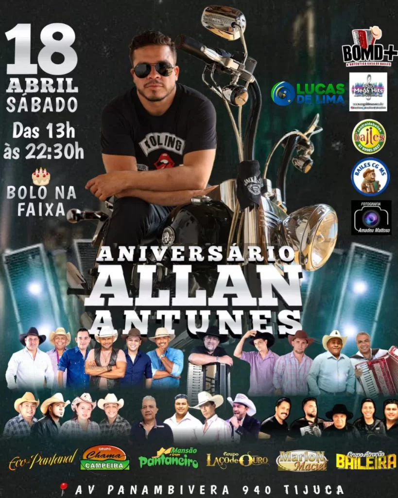 O produtor de eventos, Allan Antunes, comemora seu aniversário neste sábado 918) com um evento que promete reunir uma expressiva seleção de artistas da música regional sul-mato-grossense. A festa será no Clube Bom D+, em Campo Grande, a partir das 13 horas.