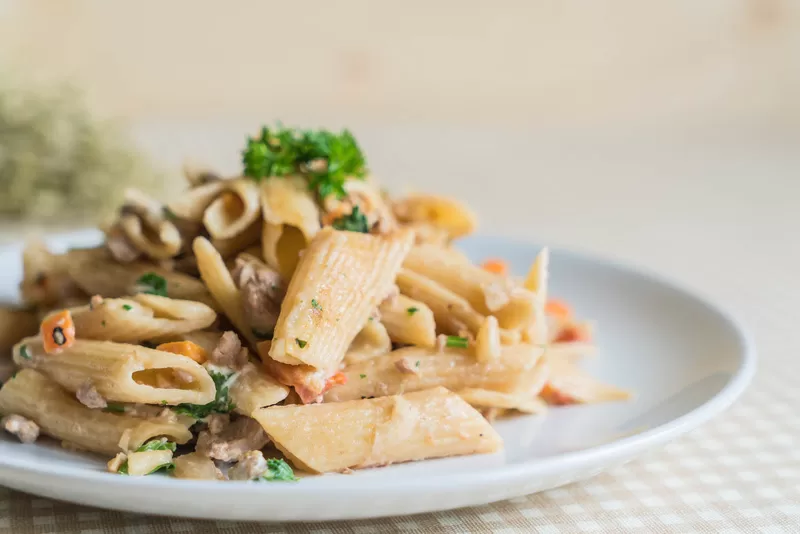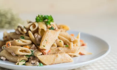Penne com filé-mignon ao molho de mostarda e cogumelos
