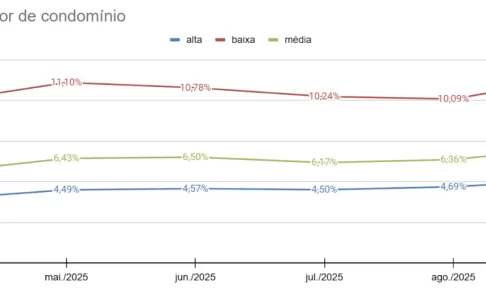 O levantamento da Superlógica revelou ainda que a taxa média de condomínio no país, entre julho e setembro, foi de 841,23 reais. Entre as regiões com as maiores taxas de condomínio, o Norte lidera com 900,51 reais, seguido do Nordeste (895,58 reais), Sudeste (863,21 reais), Centro-Oeste (738,73 reais) e Sul (665,54 reais).