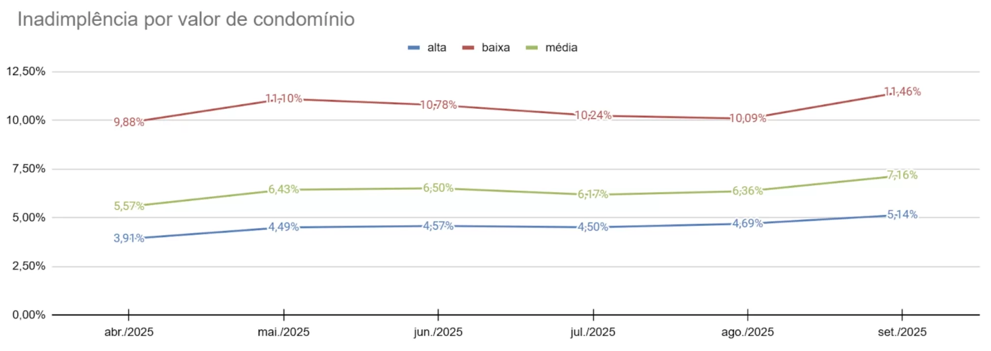No fechamento do trimestre, setembro registrou 11,46% de inadimplência em condomínios de até 500 reais, com um crescimento de 1,37 ponto percentual em relação a agosto. Já os condomínios com valores entre 500 e 1000 reais registram uma taxa de 7,16% (alta de 0,8 ponto percentual em relação ao mês anterior). E nos condomínios acima de 1000 reais, a inadimplência ficou em 5,14%, com avanço de 0,45 ponto percentual em relação a agosto. Nas três faixas de valores, a inadimplência foi a maior desde abril deste ano e possui uma distância de 6,3 pontos percentuais entre os extremos.