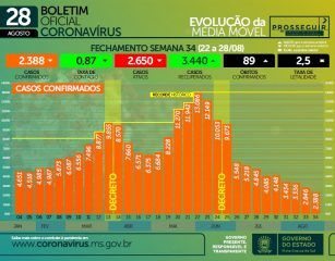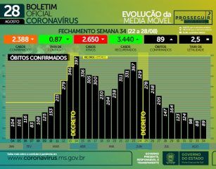 No último sábado (28) a Secretaria de Estado de Saúde (SES) encerrou a semana epidemiológica n° 34 que registrou 2.388 novos casos, 89 óbitos e taxa de contágio de 0.87. No comparativo com a semana anterior, foram 458 casos a menos, porém, um óbito a mais. Ainda assim, no comparativo com as quatro últimas semanas, a tendência é de queda à estabilidade.