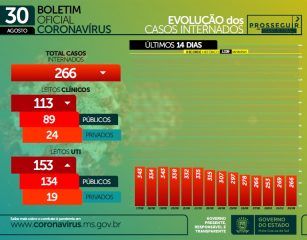 De 2.524 casos ativos atualmente no Estado, 266 são pacientes internados em leitos clínicos (113) e de UTI (153). Conforme o gráfico da evolução de pacientes internados, houve um pequeno aumento de pacientes internados nos últimos dois dias.