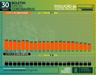 Nas últimas 24 horas a Secretaria de Estado de Saúde confirmou mais 8 óbitos pela doença no Estado, sendo 5 de Campo Grande, 2 de Três Lagoas e 1 de Água Clara. A média móvel de óbitos está em 12,6. Com a atualização, o total de mortes desde o início da pandemia no Estado chega a 9.364.