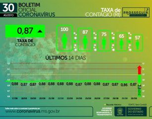 O indicador aponta que na última semana foram confirmados 281 novos casos por dia em Mato Grosso do Sul. Vale lembrar que o recorde histórico, alcançado no dia 8 de junho, foi de 2.003 casos registrados em um único dia.  A taxa de contágio dos últimos 14 dias vem se mantendo entre 0.88 e 0.86. Neste início de semana esse indicador ficou em 0.87.