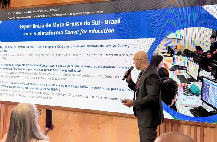 Daher palestrou sobre o uso de ferramentas em parceria com Google e Canva na REE (Rede Estadual de Ensino). O tema central da apresentação foi o uso do serviço Canva for Education, fruto de uma parceria firmada em junho de 2023 com a SED (Secretaria de Estado de Educação).
