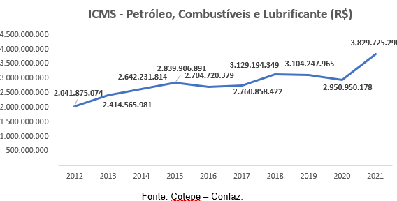 O setor Petróleo, Combustíveis e Lubrificantes, ao englobar a distribuição de combustíveis às siderúrgicas, termelétricas, bem como ao próprio consumidor final, possui grande participação na arrecadação do ICMS no Estado. Segundo dados do Confaz, representa a segunda maior arrecadação do ano de 2021, R$ 3,8 bilhões.