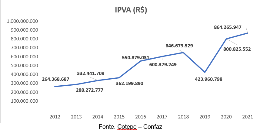 O IPVA 2021 apresentou alta de 7,92% em relação a 2020, com um saldo de R$ 864 milhões. Segundo essa análise, a arrecadação do IPVA foi um dos tributos com maior média de crescimento na última década, 18,3%.