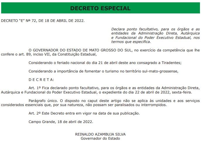 Considerando o feriado nacional consagrado a Tiradentes e a importância de fomentar o turismo em Mato Grosso do Sul, o governador Reinaldo Azambuja declarou ponto facultativo o expediente do dia 22 (sexta-feira) para os órgãos e as entidades da Administração Direta, Autárquica e Fundacional do Poder Executivo Estadual.