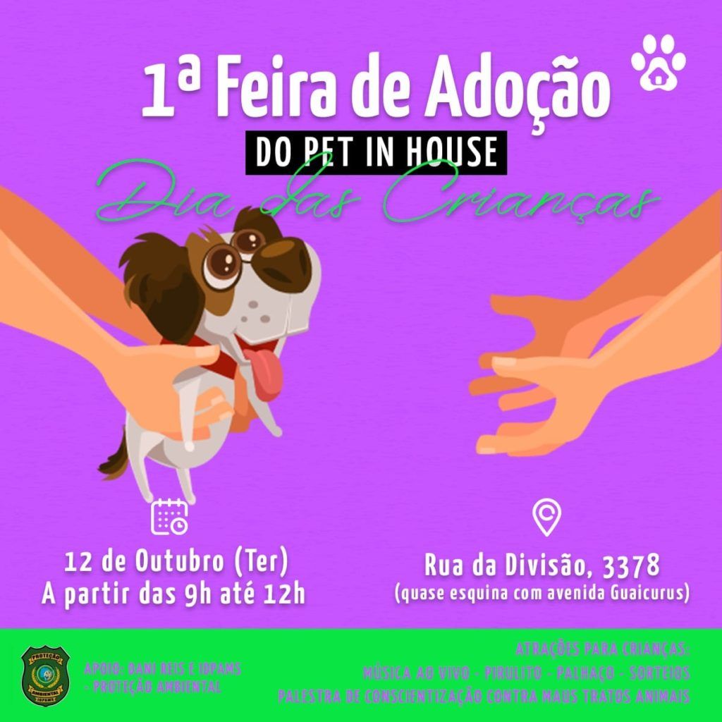 A empresa Pet In House realiza na próxima terça-feira (12), a primeira Feira de Adoção, serão realizadas palestras de conscientização contra maus tratos em animais. Também contará com sorteio, apresentações culturais e entrega de pirulitos para as crianças.