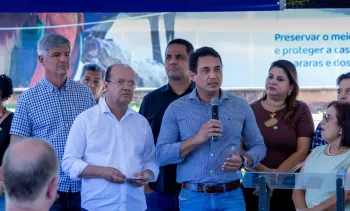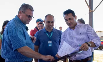 Ao lado de vereadores e gerentes, o prefeito Rodrigo Sacuno assina a Ordem de Serviço…