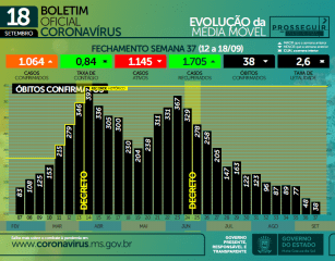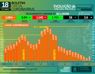 A semana epidemiológica n. 37 encerrou com 1.064 novos casos confirmados, 1.705 casos recuperados, e 38 óbitos confirmados na semana de 12 a 18 de setembro. O número de casos foi maior que a semana anterior, por outro lado, a semana 37 teve dez óbitos a menos que a anterior.