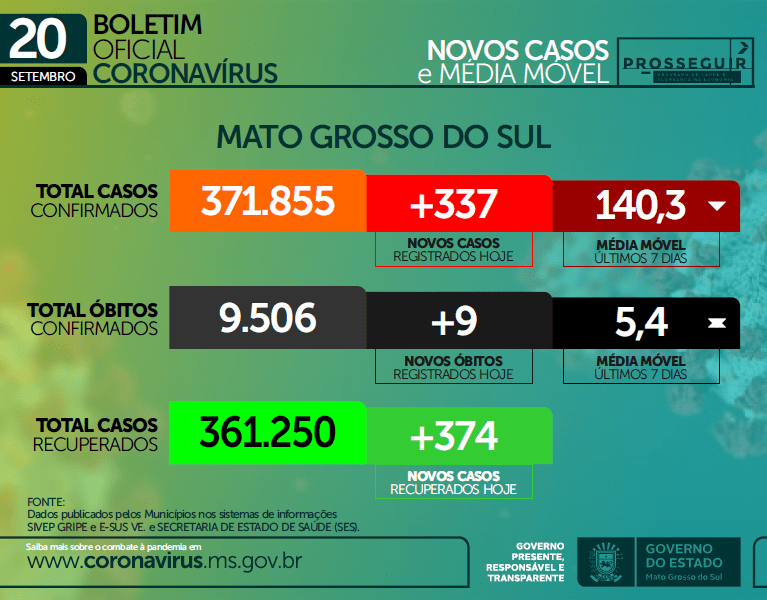 Durante o final de semana a Secretaria de Estado de Saúde (SES) confirmou 9 óbitos de pacientes que residiam em Campo Grande (5), Três Lagoas (2), Coxim (1) e Sidrolândia (1). A média móvel indica que nos últimos 7 dias foram registrados 5,4 mortes diárias por Covid.