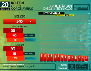 As internações pela doença se mantiveram estáveis, e nesta segunda-feira são 149 pacientes internados, sendo 56 em leitos clínicos e 93 em leitos de UTI.