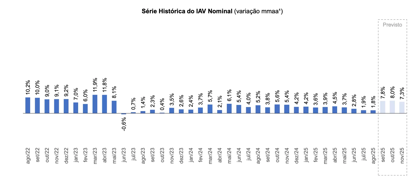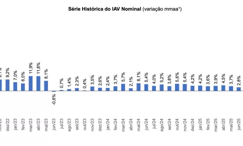 Já os dados apresentados pelo IAV-IDV ajustados pelo IPCA, de setembro/25, apontam crescimento de 2,5% em setembro, 3,0% em outubro e 2,4% em novembro. Em agosto, houve queda de 3,3% em relação ao mesmo mês de 2024.